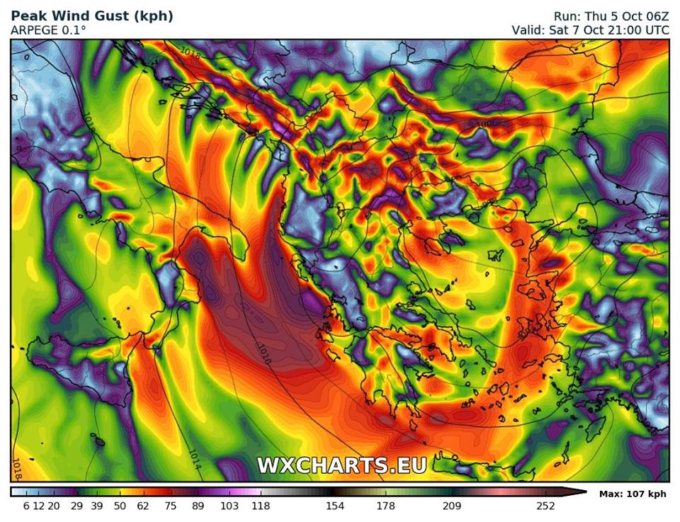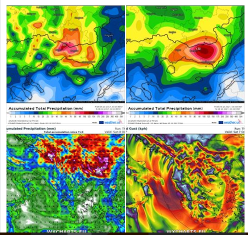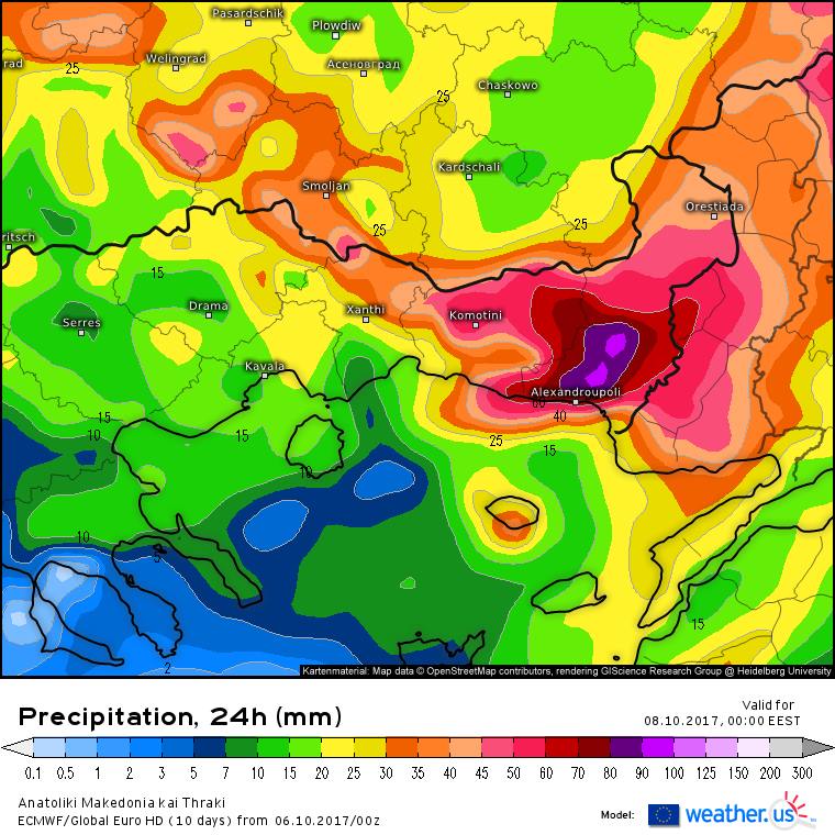 Το control run ECMWF του Ευρωπαϊκού εξακολουθούν να δίνουν πολύ νερό με επίκεντρο την Αλεξανδρούπολη για αύριο Σαββάτο 09 Οκτωβρίου 2017 και ριπές αέρα αργά το βράδυ του Σαββάτου και Κομοτηνή έως και 100 χλμ αναφέρει η έγκυρη ομάδα των “Καιρικών νέων Θράκης” από την Κομοτηνή.