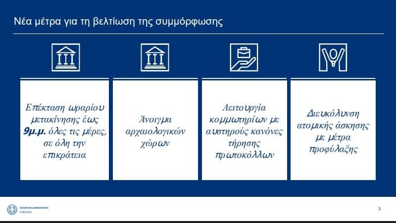 Συγκεκριμένα στα μέτρα συμπεριλαμβάνονται η επέκταση του ωραρίου μετακίνησης έως τις 21:00 για όλες τις ημέρες, το άνοιγμα αρχαιολογικών χώρων, τη λειτουργία των κομμωτηρίων και τη διευκόλυνση της ατομικής άσκησης με μέτρα προφύλαξης. Ο Νίκος Χαρδαλιάς, τόνισε ότι ΔΕΝ θα επιτρέπεται η μετακίνηση με το αυτοκίνητο με τον κωδικό 6.