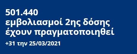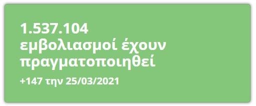 Σημειώνεται ότι οι εμβολιασμοί που έχουν πραγματοποιηθεί στη χώρα μας ξεπερνούν πλέον το 1,5 εκατομμύριο. Συγκεκριμένα, σύμφωνα με τα στοιχεία που δημοσιεύει η Εθνική Εκστρατεία Εμβολιασμού για την COVID-19 μέχρι και σήμερα έχουν πραγματοποιηθεί 1.537.104 εμβολιασμοί. Έως σήμερα, 501.440 συμπολίτες μας έχουν ήδη λάβει και τη δεύτερη δόση των εμβολίων.