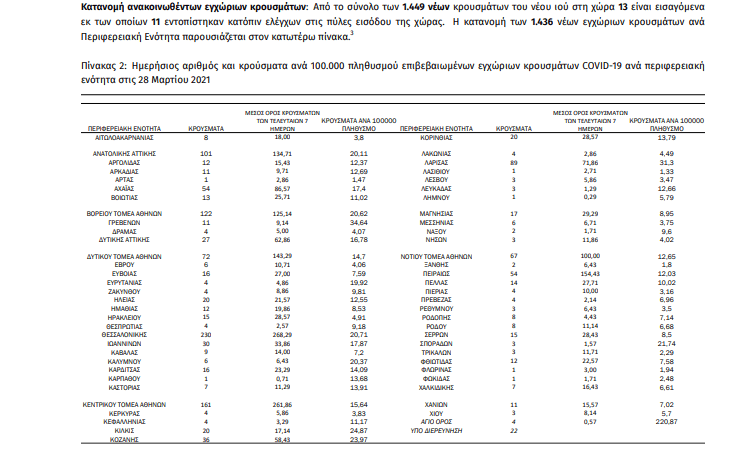 Με βάση τα επιβεβαιωμένα κρούσματα των τελευταίων 7 ημερών, 55 θεωρούνται σχετιζόμενα με ταξίδι από το εξωτερικό και 2.605 είναι σχετιζόμενα με ήδη γνωστό κρούσμα.
