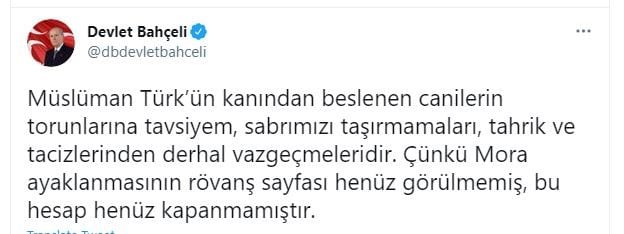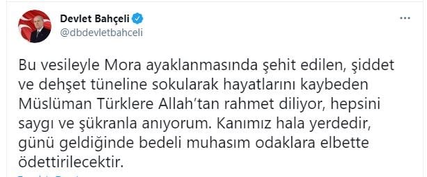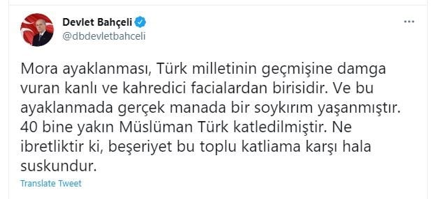 Μεταξύ άλλων επεσήμανε ότι η εξέγερση του Μοριά «είναι μία από τις πιο αιματηρές και συντριπτικές καταστροφές που σημάδεψαν το παρελθόν του τουρκικού έθνους. Και σ’ αυτήν την εξέγερση μία πραγματική γενοκτονία έλαβε χώρα. Σχεδόν 40.000 Τούρκοι μουσουλμάνοι σκοτώθηκαν. Το ειρωνικό είναι που η ανθρωπότητα παραμένει ακόμη σιωπηλή απέναντι σ’ αυτήν τη μαζική δολοφονία» συνεχίζει το παραλήρημά του ο αρχηγός του ακροδεξιού κόμματος της Τουρκίας. Και δεν σταμάτησε εκεί: «Η συμβουλή μου στα εγγόνια των δολοφόνων που τρέφονται από το αίμα των μουσουλμάνων Τούρκων είναι να μην εξαντλούν την υπομονή μας και αμέσως να αφήσουν τις προκλήσεις και τις παρενοχλήσεις, Επειδή η σελίδα του επαναληπτικού αγώνα για την εξέγερση του Μοριά δεν έχει γίνει ακόμη θεατή, ο λογαριασμός αυτός δεν έχει κλείσει ακόμη. Με αυτήν την αφορμή, εύχομαι το έλεος του θεού στους μουσουλμάνους Τούρκους που μαρτύρησαν στην εξέγερση του Μοριά και έχασαν τις ζωές τους μπαίνοντας στο τούνελ της βίας και του τρόμου. Τους θυμάμαι όλους με σεβασμό και ευγνωμοσύνη. Το αίμα μας είναι ακόμη στο έδαφος, όταν έρθει η μέρα θα πληρωθεί το τίμημα από την αντίπαλη πλευρά».