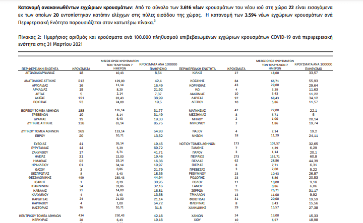 Σύμφωνα με τον ΕΟΔΥ,τα νέα εργαστηριακά επιβεβαιωμένα κρούσματα της νόσου που καταγράφηκαν τις τελευταίες 24 ώρες είναι 3.616, εκ των οποίων 20 εντοπίστηκαν κατόπιν ελέγχων στις πύλες εισόδου της χώρας.