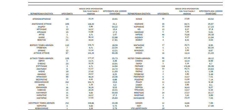 Σύμφωνα με τον ΕΟΔΥ, τα νέα εργαστηριακά επιβεβαιωμένα κρούσματα της νόσου που καταγράφηκαν τις τελευταίες 24 ώρες είναι 1.955, εκ των οποίων 6 εντοπίστηκαν κατόπιν ελέγχων στις πύλες εισόδου της χώρας. Ο συνολικός αριθμός των κρουσμάτων ανέρχεται σε 275.414 (ημερήσια μεταβολή +0.7%), εκ των οποίων 51.4% άνδρες. Με βάση τα επιβεβαιωμένα κρούσματα των τελευταίων 7 ημερών, 77 θεωρούνται σχετιζόμενα με ταξίδι από το εξωτερικό και 3.313 είναι σχετιζόμενα με ήδη γνωστό κρούσμα.