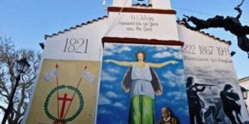 Μέσα στον άι Γιώργη η Πλατυτέρα, έξω στο καμπαναριό φρουρός η Ευγνωμονούσα.