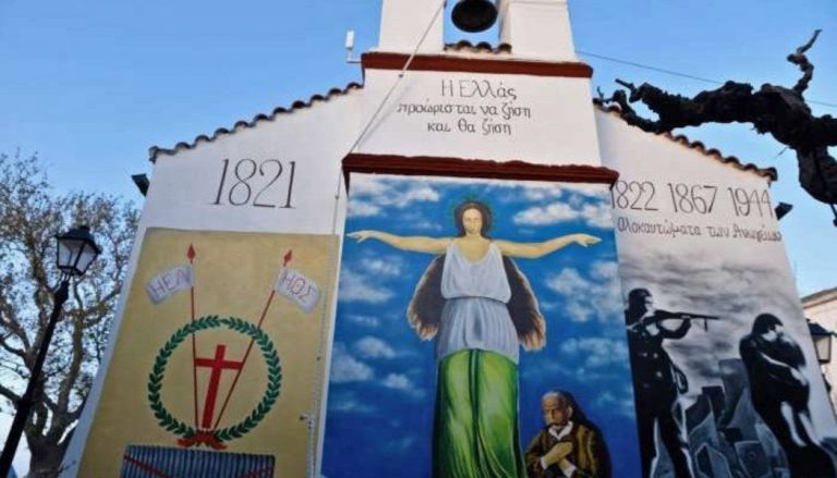 Με αυτή την περίφημη φράση του Χαρίλαου Τρικούπη, χαραγμένη ψηλά, ολοκληρώθηκαν στην εκκλησία του Αη Γιώργη στο Μεϊντάνι, οι τρεις τοιχογραφίες, στα ισάριθμα επίπεδα που βρίσκονται κάτω από το καμπαναριό.
