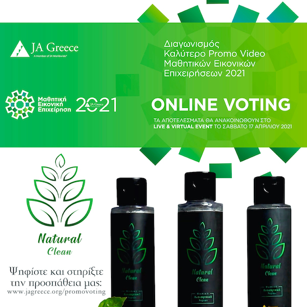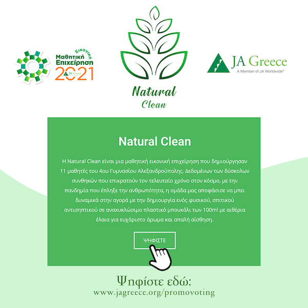 Με μεγάλη μας χαρά θα θέλαμε να σας ενημερώσουμε ότι το διαφημιστικό σποτ της εικονικής επιχείρησης Natural Clean των μαθητών της Γ΄ τάξης του 4ου Γυμνασίου Αλεξανδρούπολης έχει ολοκληρωθεί με επιτυχία. Το διαφημιστικό μας συμμετέχει στον Διαγωνισμό Καλύτερο Promo Video Μαθητικών Εικονικών Επιχειρήσεων 2021 τουΣωματείου Επιχειρηματικότητας Νέων JA Greece.