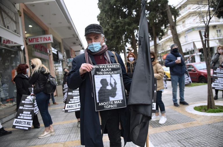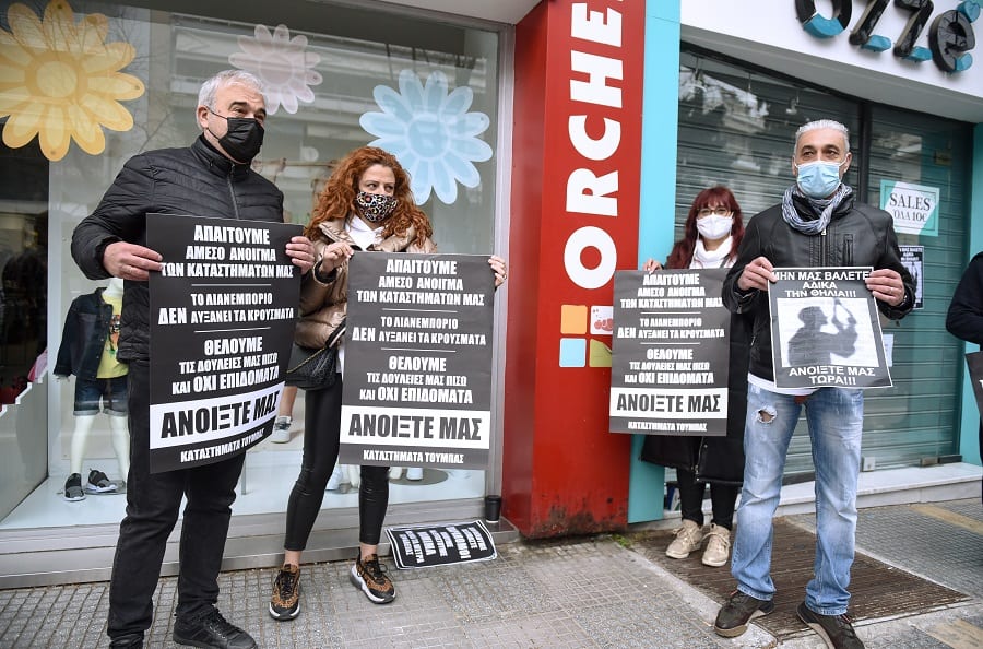 Συμβολική διαμαρτυρία εμπόρων στην Τούμπα, , πραγματοποιήθηκε το πρωί μετά την απόφαση να μείνουν κλειστά τα μαγαζιά του λιανεμπορίου στη Θεσσαλονίκη.