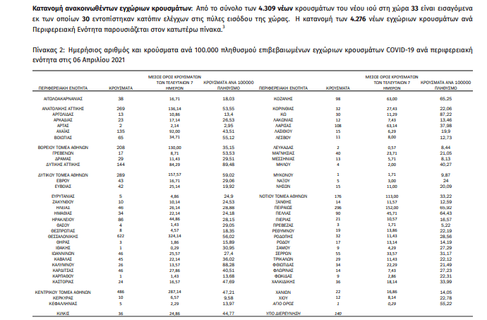 Με βάση τα επιβεβαιωμένα κρούσματα των τελευταίων 7 ημερών, 94 θεωρούνται σχετιζόμενα με ταξίδι από το εξωτερικό και 2.773 είναι σχετιζόμενα με ήδη γνωστό κρούσμα.