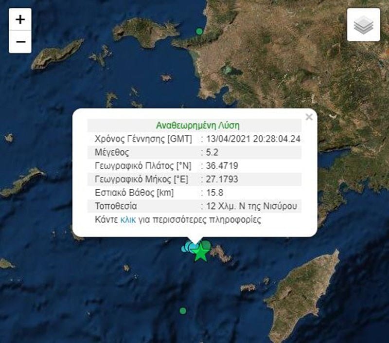 Σεισμική δόνηση μεγέθους 5,2 βαθμών της κλίμακας ρίχτερ σημειώθηκε το βράδυ της Τρίτης (13/4) ανάμεσα σε Τήλο και Νίσυρο.