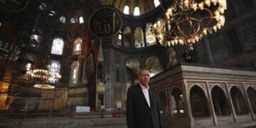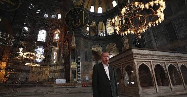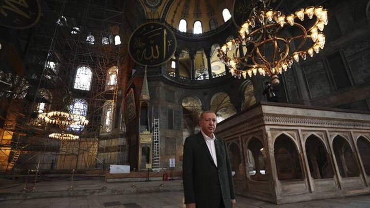 Ο γιαλατζί σουλτάνος Ρετζέπ Ταγίπ Ερντογάν αφού βεβήλωσε τον μεγαλοπρεπή ναό, μνημείο παγκόσμιας πολιτισμικής κληρονομιάς και τον μετέτρεψε σε τζαμί, προσπαθεί προσευχόμενος μέσα στους αγιασμένους τοίχους της να κλέψει από την ακτινοβολία της. Αλλά όπως λέει μια παροιμία, «τον γύφτο όσο και να τον πλένεις το σαπούνι σου χαλάς¨. Έτσι και ο Οθωμανός, όσο και να προσπαθεί να οικειοποιηθεί πράγματα που δεν του ανήκουν, θα παραμένει ένας νομάς, γενοκτόνος από της στέπες της Ανατολής.