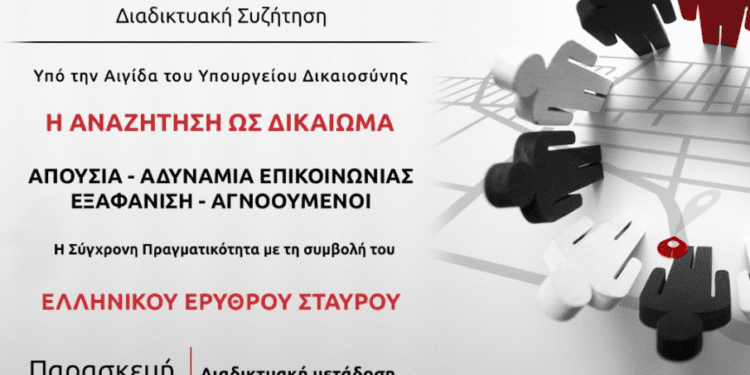 Διαδικτυακή Ημερίδα, με θέμα: ««Η ΑΝΑΖΗΣΗ ΩΣ ΔΙΚΑΙΩΜΑ ΑΠΟΥΣΙΑ – ΑΔΥΝΑΜΙΑ ΕΠΙΚΟΙΝΩΝΙΑΣ – ΕΞΑΦΑΝΙΣΗ – ΑΓΝΟΟΥΜΕΝΟΙ – Η Σύγχρονη Πραγματικότητα με τη συμβολή του Ελληνικού Ερυθρού Σταυρού» πραγματοποιεί στις 23 Απριλίου 2021, υπό την αιγίδα του Υπουργείου Δικαιοσύνης, ο Τομέας Αναζητήσεων του Ελληνικού Ερυθρού Σταυρού. Την κήρυξη των εργασιών της ημερίδας θα κάνει ο Υπουργός Δικαιοσύνης κ. Κώστας Τσιάρας.