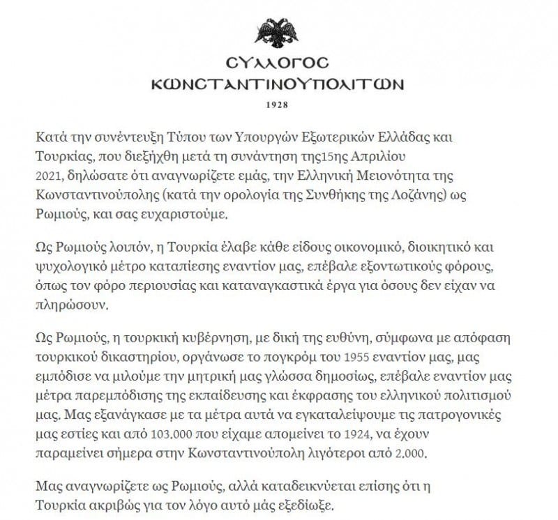 Κατά την συνέντευξη Τύπου των Υπουργών Εξωτερικών Ελλάδας και Τουρκίας, που διεξήχθη μετά τη συνάντηση της15ης Απριλίου 2021, δηλώσατε ότι αναγνωρίζετε εμάς, την Ελληνική Μειονότητα της Κωνσταντινούπολης (κατά την ορολογία της Συνθήκης της Λοζάνης) ως Ρωμιούς, και σας ευχαριστούμε.