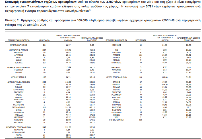 Με βάση τα επιβεβαιωμένα κρούσματα των τελευταίων 7 ημερών, 50 θεωρούνται σχετιζόμενα με ταξίδι από το εξωτερικό και 2.960 είναι σχετιζόμενα με ήδη γνωστό κρούσμα.