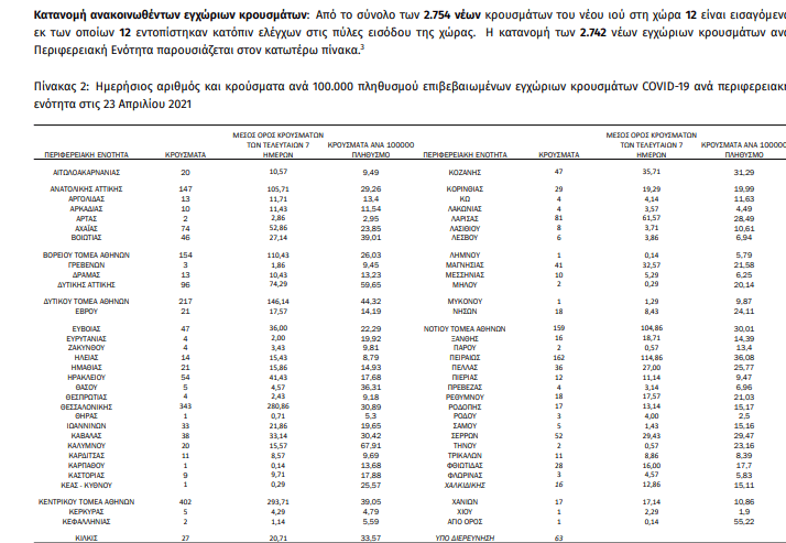 Με βάση τα επιβεβαιωμένα κρούσματα των τελευταίων 7 ημερών, 65 θεωρούνται σχετιζόμενα με ταξίδι από το εξωτερικό και 3.094 είναι σχετιζόμενα με ήδη γνωστό κρούσμα.