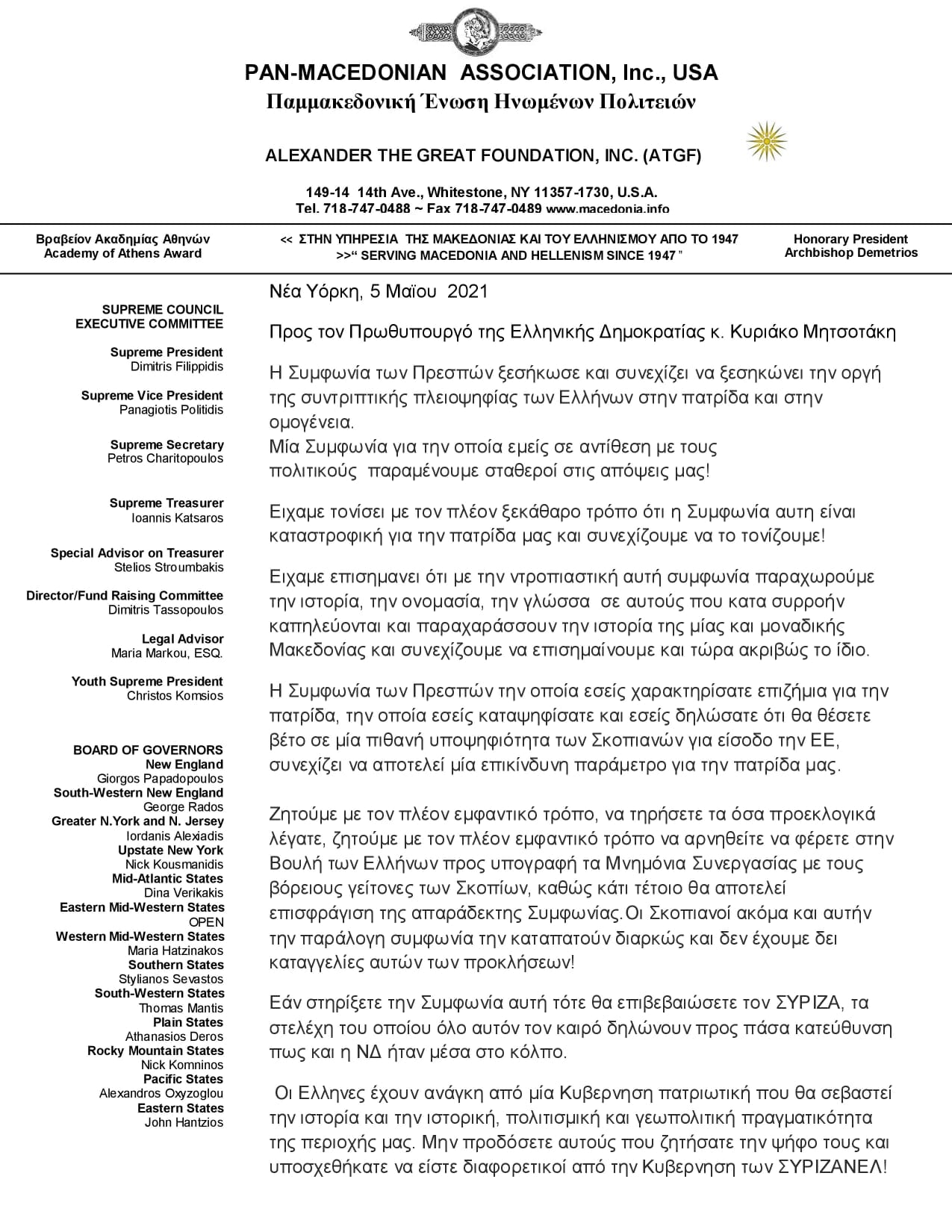 Ανοιχτή Επιστολή προς τον Πρωθυπουργό της Ελλάδος κ. Κυριάκο Μητσοτάκη απέστειλε η Παμμακεδονική Ενωση Αμερικής χτυπώντας το καμπανάκι για την επικείμενη συζήτηση στην Βουλή των Μνημονίων συνεργασίας Ελλάδος- Σκοπίων. Την Επιστολή υπογράφουν ο πρόεδρος της Οργάνωσης Δημήτρης Φιλιππίδης και ο επικεφαλής της Επιτροπής του Εθνικού θέματος Δημήτρης Χατζής.