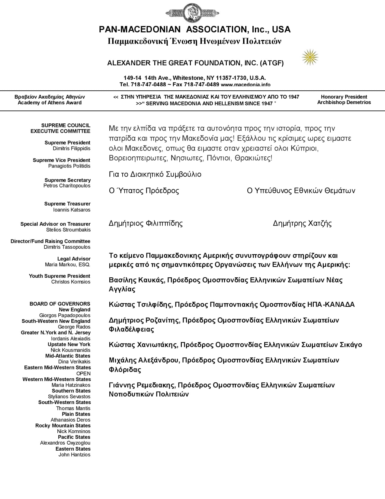 Το κείμενο Παμμακεδονικης Αμερικής συνυπογράφουν στηρίζουν και μερικές από τις σημαντικότερες Οργανώσεις των Ελλήνων της Αμερικής: