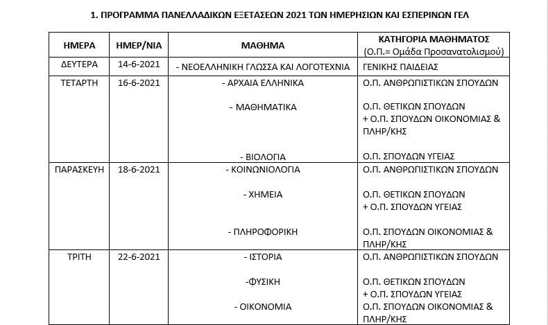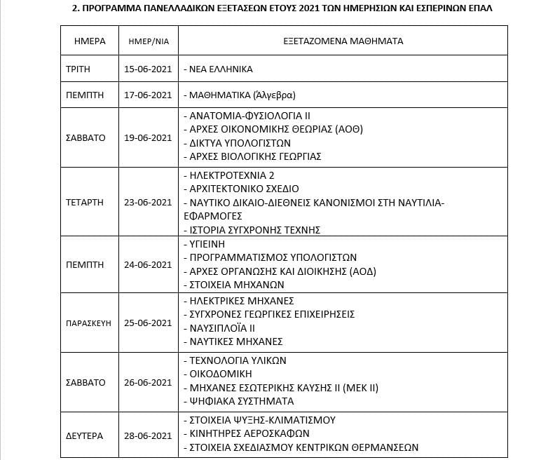 Οι πανελλήνιες εξετάσεις ξεκινούν και φέτος με το μάθημα της Νεοελληνικής Γλώσσας, τη Δευτέρα 14 Ιουνίου για τα ΓΕΛ και την Τρίτη 15 Ιουνίου για τα ΕΠΑΛ με τα Νέα Ελληνικά. Για τους υποψηφίους των ημερήσιων και εσπερινών ΓΕΛ οι πανελλαδικές τελειώνουν την Τρίτη 22 Ιουνίου, με τα μαθήματα: Ιστορία, Φυσική, Οικονομία. Για τους υποψηφίους των ημερήσιων και εσπερινών ΕΠΑΛ οι πανελλαδικές τελειώνουν τη Δευτέρα 28 Ιουνίου, με τα μαθήματα: Στοιχεία Ψύξης-Κλιματισμού, Κινητήρες Αεροσκαφών και Στοιχεία Σχεδιασμού Κεντρικών Θερμάνσεων.