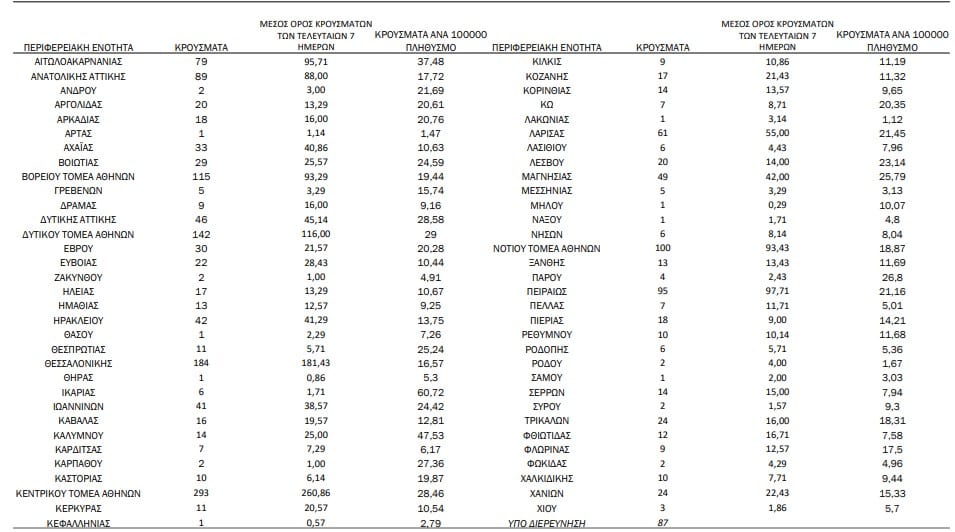 Με βάση τα επιβεβαιωμένα κρούσματα των τελευταίων 7 ημερών, 49 θεωρούνται σχετιζόμενα με ταξίδι από το εξωτερικό και 2.677 είναι σχετιζόμενα με ήδη γνωστό κρούσμα.