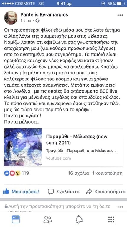 «Οι περισσότεροι φίλοι εδώ μέσα μου στείλατε αίτημα φιλίας λόγω της συμμετοχής μου στις μέλισσες. Νομίζω λοιπόν ότι οφείλω να σας γνωστοποιήσω την αποχώρηση μου (για καθαρά προσωπικούς λόγους) από το αγαπημένο μου συγκρότημα. Τα παιδιά είναι ορειβάτες και έχουν νέες κορφές να κατακτήσουν αλλά δυστυχώς δεν μπορώ να ακολουθήσω. Κρατάω λοιπόν μία μέλισσα στο μπράτσο μου, τους καλύτερους φίλους του κόσμου και εννιά χρόνια γεμάτα υπέροχες αναμνήσεις. Μετά τις εμφανίσεις στο Λονδίνο , με τις οποίες θα φτάσουμε τα 800 live, κλείνει για μένα ένας μεγάλος και σπουδαίος κύκλος. Το πόσο αγαπώ και ευγνωμονώ όσους στάθηκαν πλάι μας ώς τώρα είναι περιττό να το γράψω.