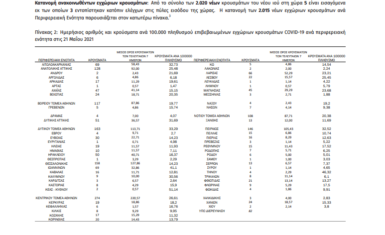 Σύμφωνα με τον ΕΟΔΥ, τα νέα εργαστηριακά επιβεβαιωμένα κρούσματα της νόσου που καταγράφηκαν τις τελευταίες 24 ώρες είναι 2.020, εκ των οποίων 3 εντοπίστηκαν κατόπιν ελέγχων στις πύλες εισόδου της χώρας. Ο συνολικός αριθμός των κρουσμάτων ανέρχεται σε 387.426 (ημερήσια μεταβολή +0.5%), εκ των οποίων 51.2% άνδρες. Με βάση τα επιβεβαιωμένα κρούσματα των τελευταίων 7 ημερών, 28 θεωρούνται σχετιζόμενα με ταξίδι από το εξωτερικό και 2.225 είναι σχετιζόμενα με ήδη γνωστό κρούσμα.