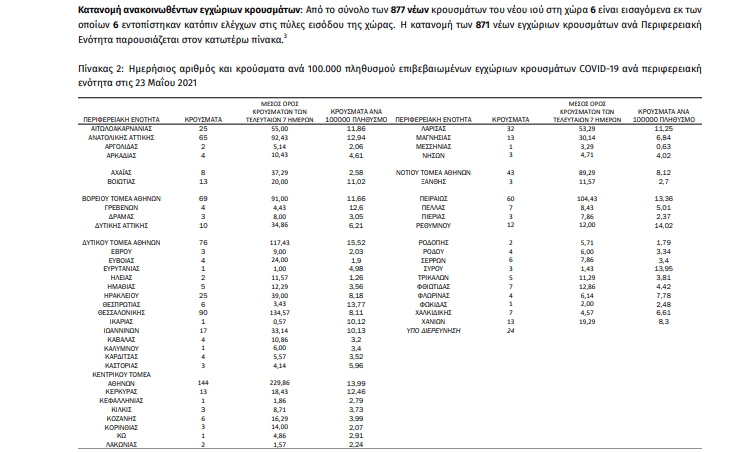 Με βάση τα επιβεβαιωμένα κρούσματα των τελευταίων 7 ημερών, 33 θεωρούνται σχετιζόμενα με ταξίδι από το εξωτερικό και 2.319 είναι σχετιζόμενα με ήδη γνωστό κρούσμα.