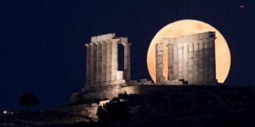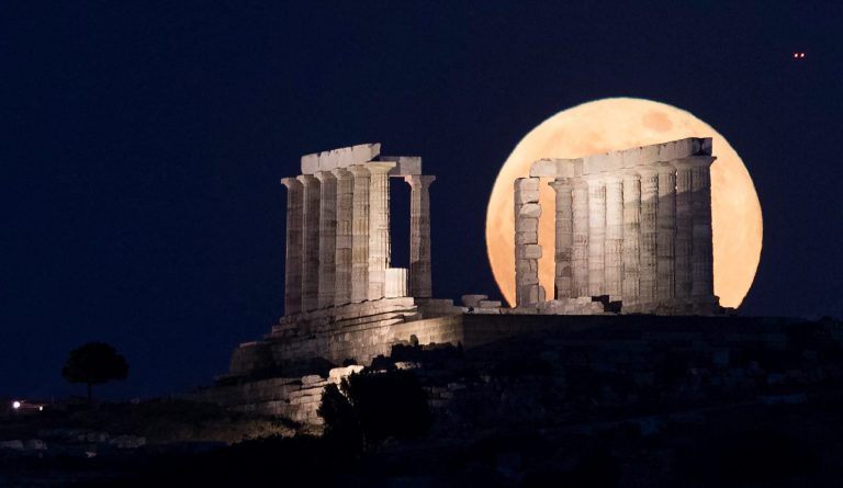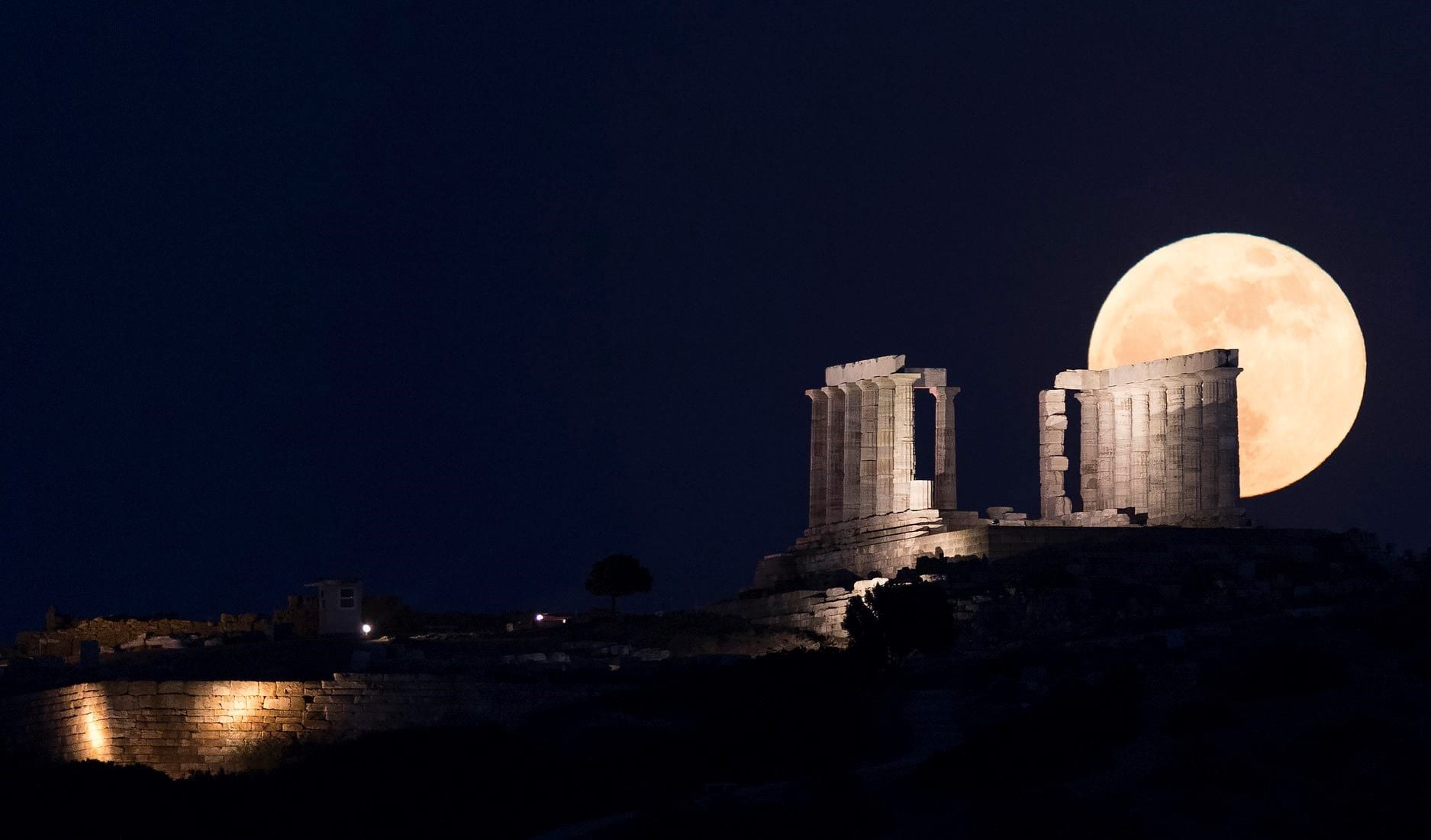 Στον Ναό του Ποσειδώνα στο Σούνιο αποτυπώθηκε το ουράνιο υπερθέαμα. Η υπερπανσέληνος του Μαΐου σκαρφάλωνε στον ουρανό, λούζοντας, παράλληλα, τον Ναό του Ποσειδώνα με το κατακόκκινο χρώμα της…