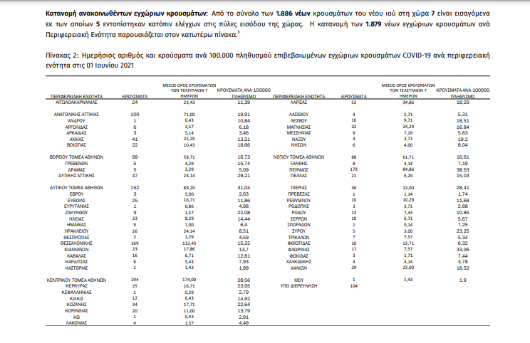 Με βάση τα επιβεβαιωμένα κρούσματα των τελευταίων 7 ημερών, 29 θεωρούνται σχετιζόμενα με ταξίδι από το εξωτερικό και 1.880 είναι σχετιζόμενα με ήδη γνωστό κρούσμα.