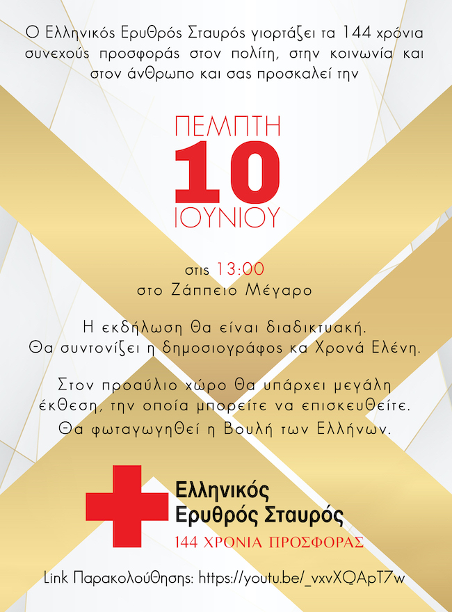 Ο Ελληνικός Ερυθρός Σταυρός στις 10 Ιουνίου συμπληρώνει 144 έτη συνεχούς εθελοντικής προσφοράς και αλληλεγγύης προς τους ευάλωτους συνανθρώπους μας. Στο πλαίσιο αυτό, διοργανώνει μεγάλη διαδικτυακή εορταστική εκδήλωση στο Ζάππειο Μέγαρο, την Πέμπτη 10 Ιουνίου, στις 13:00.