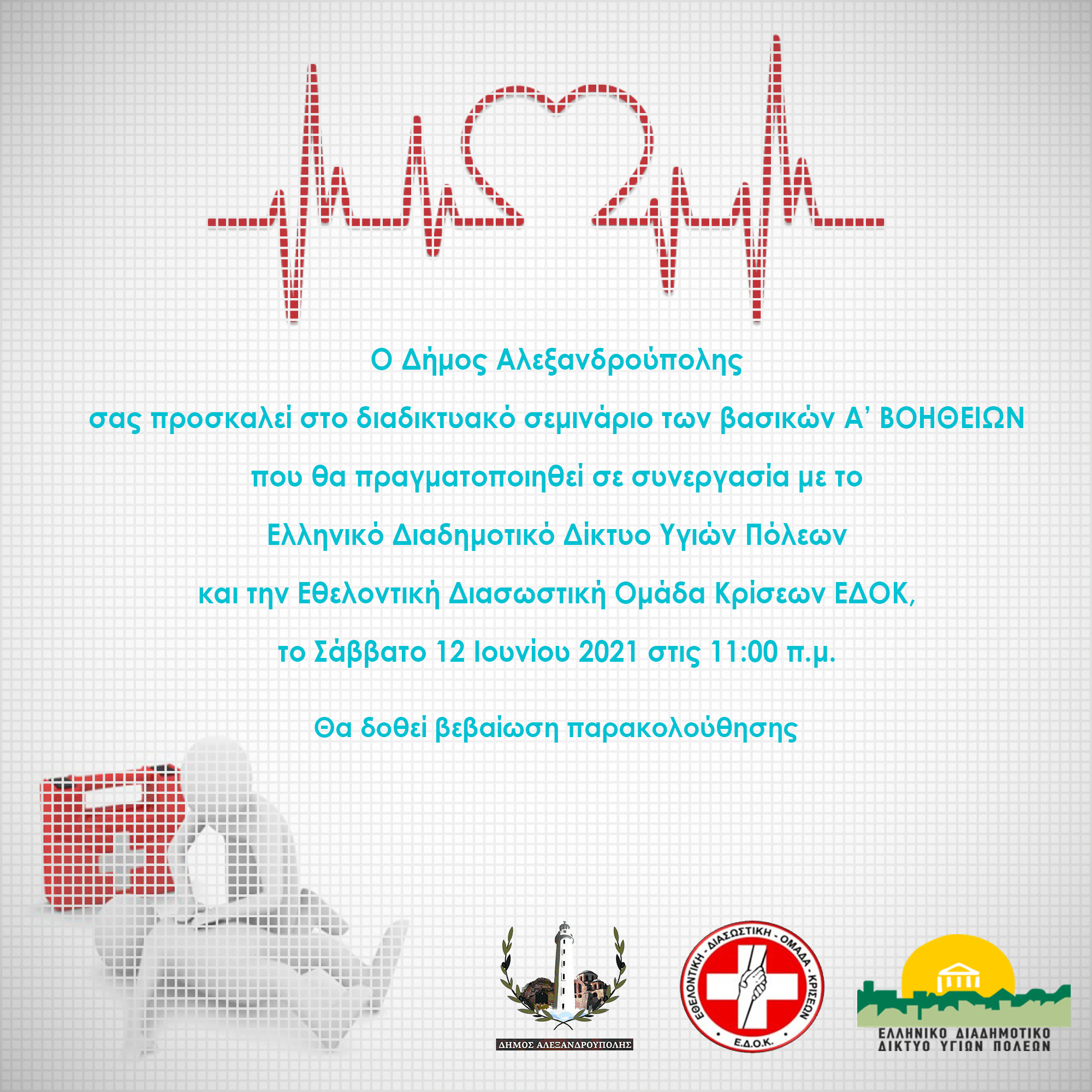 Το Ελληνικό Διαδημοτικό Δίκτυο Υγιών Πόλεων, σε συνεργασία με τον Δήμο Αλεξανδρούπολης και τους διασώστες της Εθελοντικής Διασωστικής Ομάδας Κρίσεων ΕΔΟΚ, διοργανώνει το Σάββατο 12 Ιουνίου και ώρα 11:00-14:00, το εξαιρετικά χρήσιμο διαδικτυακό σεμινάριο Α’ Βοηθειών «Η γνώση σώζει ζωές».