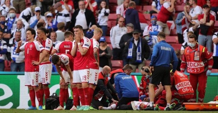 Το ματς διακόπηκε στο 42ο λεπτό μετά απόαιφνίδια πτώση του διεθνούς άσου της Δανίας και για τουλάχιστον 15 λεπτά του παρασχέθηκαν οι πρώτες βοήθειες για να μην χάσει τη ζωή του, ενώ χρησιμοποιήθηκε και απινιδωτής. Οι παίκτες των δύο ομάδων ξέσπασαν σε κλάματα, όπως και στις εξέδρες χιλιάδες θεατές παρακολουθούσαν συγκλονισμένοι τις προσπάθειες του ιατρικού τημ να σωθεί ο αθλητής.