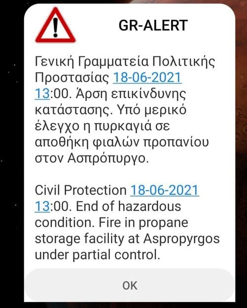 Με νέο μήνυμα της Γενικής Γραμματείας Πολιτικής Προστασίας άρθηκε η κατάσταση έκτακτης επικινδυνότητας στην πυρκαγιά που ξέσπασε νωρίτερα σε βυτιοφόρο και αποθήκη φιαλών προπανίου στον Ασπρόπυργο.