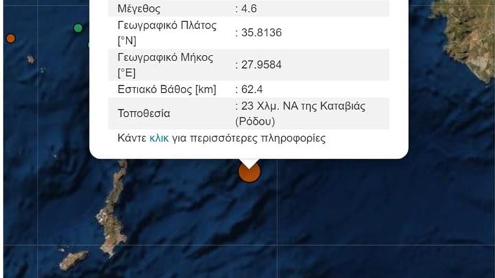 Σύμφωνα με την Αυτόματη Λύση του Γεωδυναμικού Ινστιτούτο Αθηνών ο σεισμός είχε μέγεθος 4,6 Ρίχτερ. Το επίκεντρο εντοπίζεται 23 χιλιόμετρα νοτιοανατολικά της Καταβιάς (Ρόδου) και το εστιακό βάθος υπολογίζεται στα 62,4 χιλιόμετρα.
