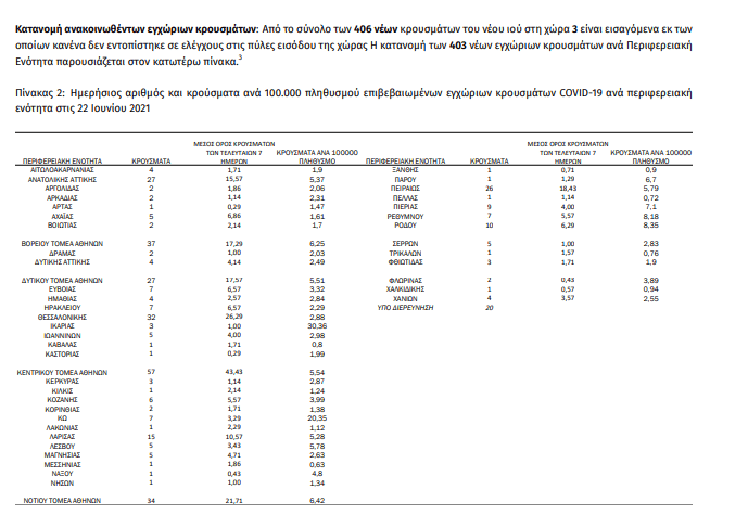 Σύμφωνα με τον ΕΟΔΥ, τα νέα εργαστηριακά επιβεβαιωμένα κρούσματα της νόσου που καταγράφηκαν τις τελευταίες 24 ώρες είναι 406, εκ των οποίων κανένα δεν εντοπίστηκε σε ελέγχους στις πύλες εισόδου της χώρας. Ο συνολικός αριθμός των κρουσμάτων ανέρχεται σε 418.943 (ημερήσια μεταβολή +0.1%), εκ των οποίων 51.2% άνδρες.