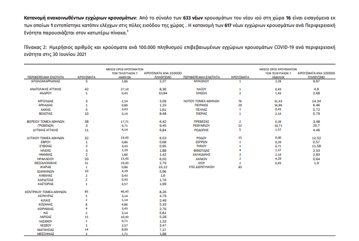 Με βάση τα επιβεβαιωμένα κρούσματα των τελευταίων 7 ημερών, 93 θεωρούνται σχετιζόμενα με ταξίδι από το εξωτερικό και 649 είναι σχετιζόμενα με ήδη γνωστό κρούσμα.