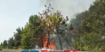 Η φωτιά, όπως φαίνεται στις εικόνες εκδηλώθηκε σε δέντρα που βρίσκονται ακριβώς δίπλα στην εθνική οδό και οι φλόγες είναι σε απόσταση αναπνοής από τον δρόμο.