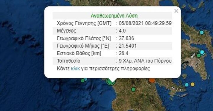 Το επίκεντρο του δεύτερου σεισμού εντοπίζεται στα εννέα χιλιόμετρα ανατολικά, νοτιοανατολικά του Πύργου, ενώ το εστιακό βάθος εκτιμάται στα 26,4 χιλιόμετρα.