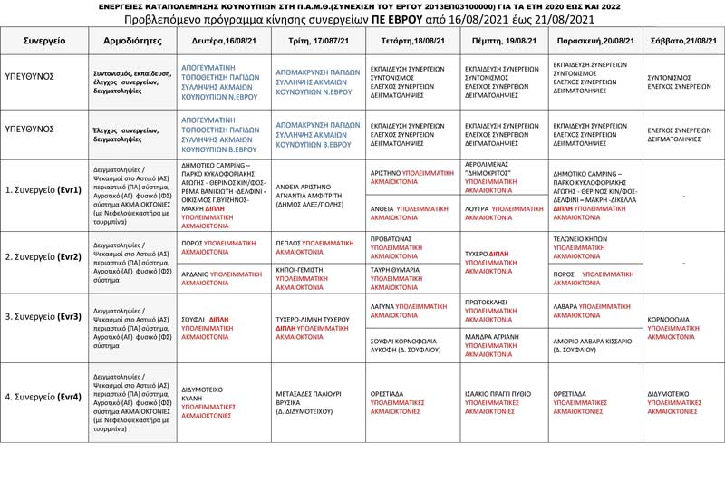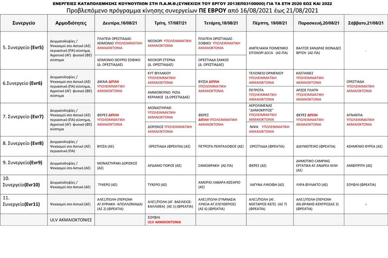 Το προβλεπόμενο πρόγραμμα κίνησης συνεργείων για την καταπολέμηση των κουνουπιών για την τρέχουσα εβδομάδα στο πλαίσιο υλοποίησης του αντίστοιχου προγράμματος που διενεργεί η Περιφέρεια Ανατολικής Μακεδονίας και Θράκης.