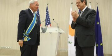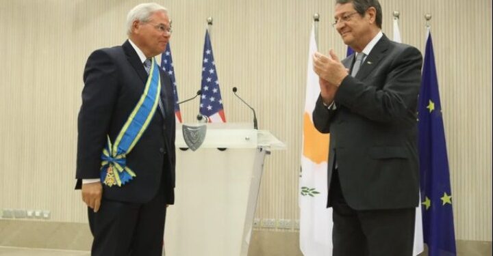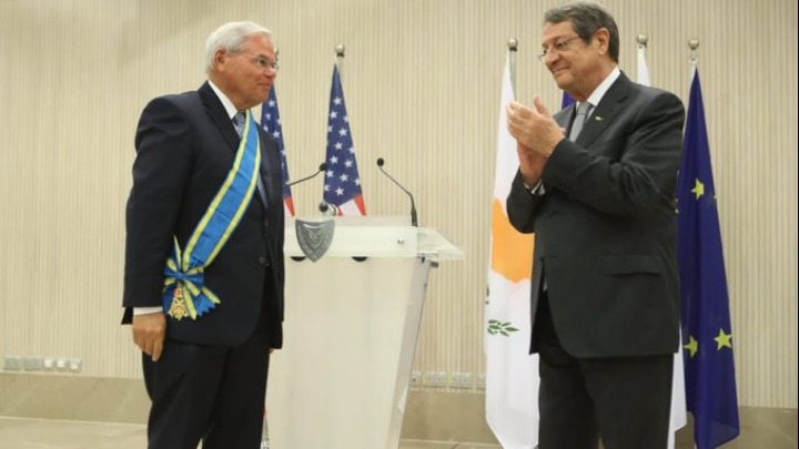 Με το παράσημο του Μεγαλόσταυρου του Τάγματος του Μακαρίου Γ΄ τίμησε τη Δευτέρα το βράδυ ο Πρόεδρος της Δημοκρατίας, Νίκος Αναστασιάδης, τον Αμερικανό Γερουσιαστή και Πρόεδρο της Επιτροπής Εξωτερικών Σχέσεων της Γερουσίας των ΗΠΑ, Ρόμπερτ Μενέντεζ, ο οποίος τόνισε πως στόχος του είναι να δει και τον τελευταίο Τούρκο στρατιώτη να φεύγει από την Κύπρο.