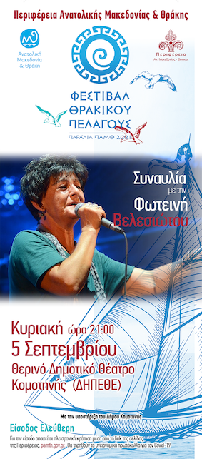 Σε συνέχεια των εκδηλώσεων, την Κυριακή 5 Σεπτεμβρίου 2021 στις 9.00 μ.μ. στον χώρο του Θερινού Δημοτικού Θεάτρου Κομοτηνής θα πραγματοποιηθεί η μουσική εκδήλωση – συναυλία με τη Φωτεινή Βελεσιώτου. Μαζί της ο Βασίλης Προδρόμου.