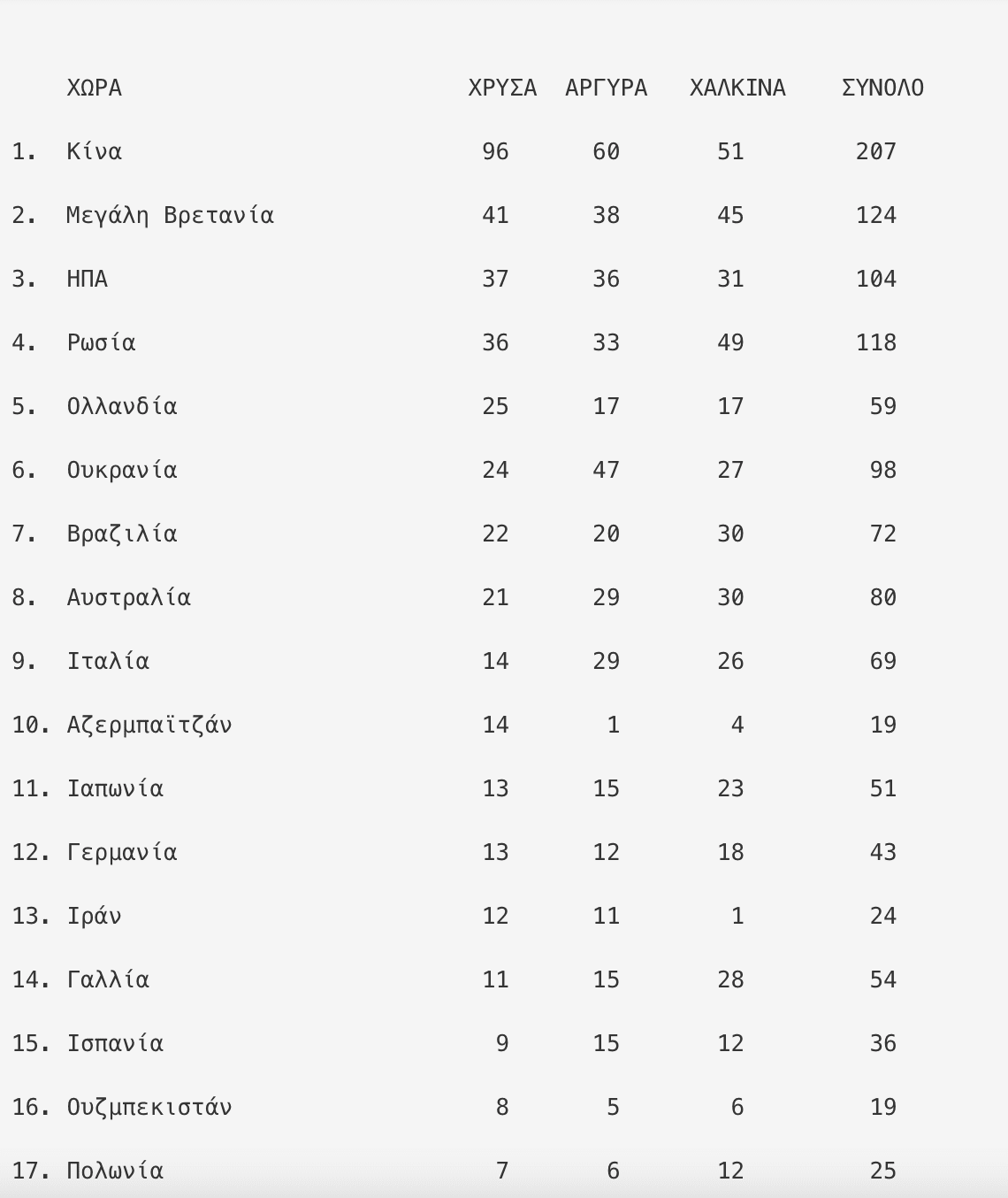 Ακολούθησαν η Μεγάλη Βρετανία και οι ΗΠΑ, με 124 και 104 μετάλλια, αντίστοιχα, ενώ ο τελικός πίνακας μεταλλίων της διοργάνωσης, που διεξήχθη στην ιαπωνική πρωτεύουσα, έχει ως εξής: