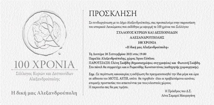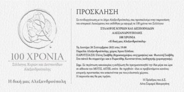 Παρουσίαση του Ιστορικού Λευκώματος “Η δική μας Αλεξανδρούπολη” που εκδόθηκε με αφορμή τα 100 χρόνια του Συλλόγου Κυριών και Δεσποινίδων, τη Δευτέρα 20 Σεπτεμβρίου, ώρα 19:00 στην παραλία της Αλεξανδρούπολης, χώρος Αγίου Εύπλου.