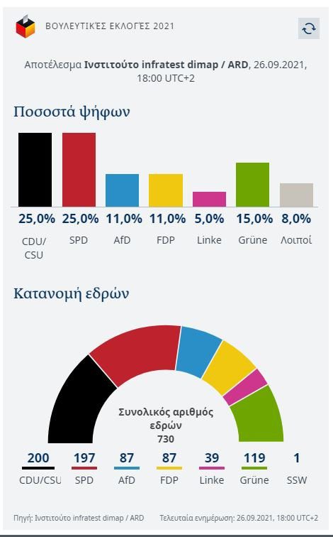 Συγκεκριμένα, το SPD συγκεντρώνει 25,7% ενώ η CDU/CSU 24,5%. Ακολουθούν οι Πράσινοι με 14,3%, οι Φιλελεύθεροι (FDP) με 11,5%, η Εναλλακτική για τη Γερμανία (AfD) με 10,5%, και η Αριστερά με το οριακό 5%.