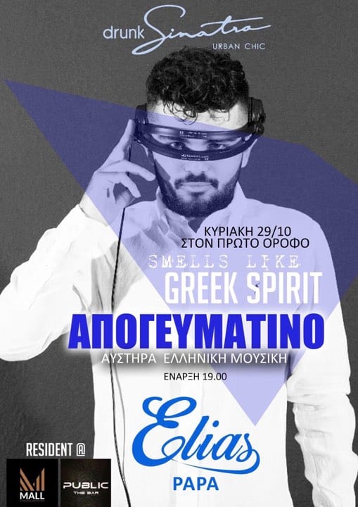 Το Νο 1 μαγαζί στην Αλεξανδρούπολη αλλάζει την ώρα διασκέδασης, την Κυριακή 29 Οκτωβρίου και στις 19:00 ο γνωστός Βεροιώτης DJ Elias Papa στο Drunk Sinatra με αυστηρά Ελληνική μουσική, μας απογειώνει και σπάει την διασκέδαση της νύχτας.