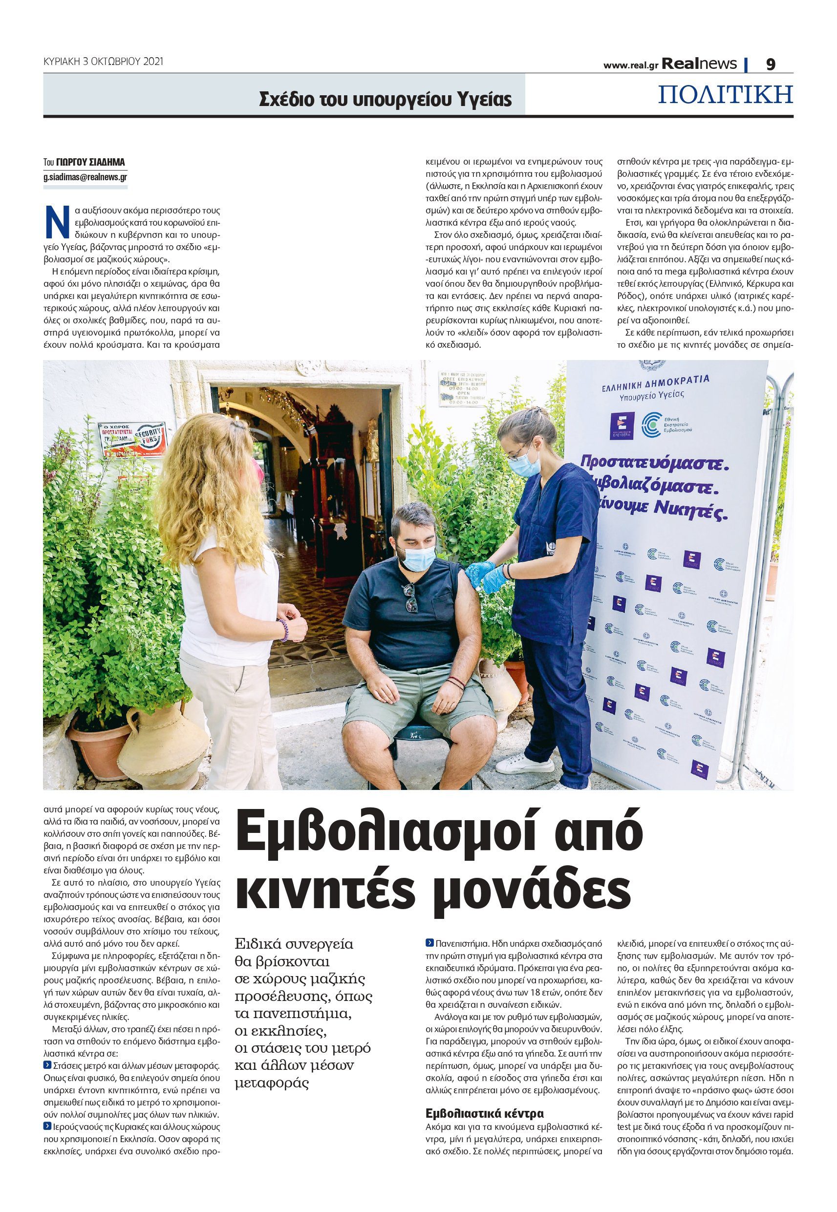 -Ιερούς ναούς τις Κυριακές και άλλους χώρους που χρησιμοποιεί η Εκκλησία. Οσον αφορά τις εκκλησίες, υπάρχει ένα συνολικό σχέδιο προκειμένου οι ιερωμένοι να ενημερώνουν τους πιστούς για τη χρησιμότητα του εμβολιασμού (άλλωστε, η Εκκλησία και η Αρχιεπισκοπή έχουν ταχθεί από την πρώτη στιγμή υπέρ των εμβολισμών) και σε δεύτερο χρόνο να στηθούν εμβολιαστικά κέντρα έξω από ιερούς ναούς.