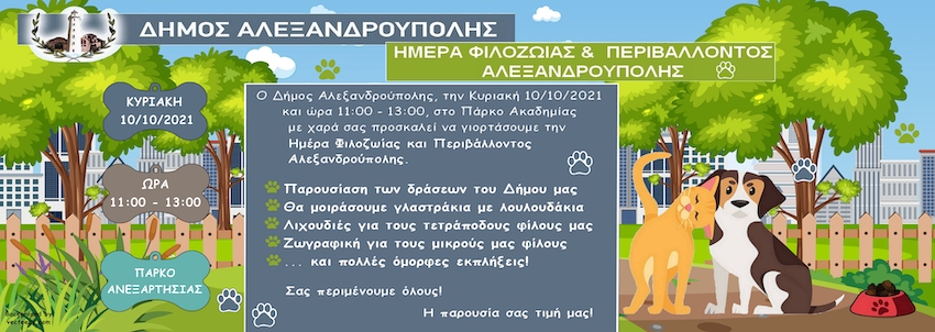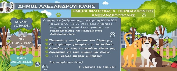 Με αφορμή την παγκόσμια ημέρα ζώων στις 4 Οκτωβρίου, σας καλούμε σε μια γιορτή φιλοζωίας και περιβάλλοντος την Κυριακή 10 Οκτωβρίου 2021, ώρες 11.00 π.μ. έως 13.00 στο πάρκο Ακαδημίας.
