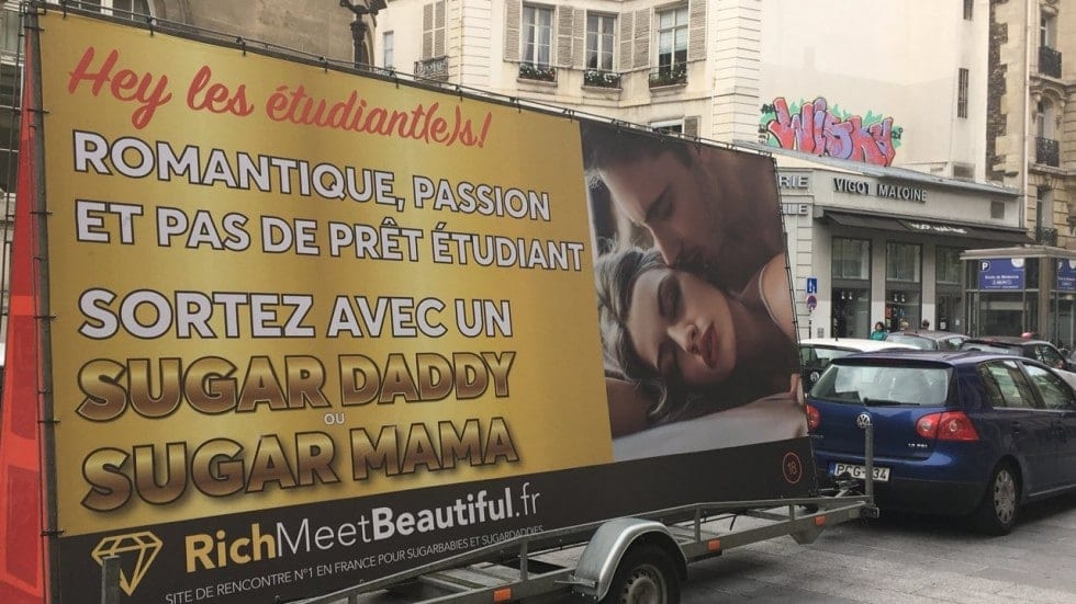 Μετά τις Βρυξέλλες, τον περασμένο μήνα, μια ιστοσελίδα γνωριμιών που καλεί τις φοιτήτριες να προτιμήσουν μια σχέση με έναν «πλούσιο» άνδρα κάποιας ηλικίας αντί να λάβουν τραπεζικό δάνειο για να χρηματοδοτήσουν τις σπουδές τους, ξεκίνησε διαφημιστική καμπάνια έξω από πανεπιστήμια στο Παρίσι, προκαλώντας την οργή των αρχών αλλά και την παρέμβαση της δικαιοσύνης.