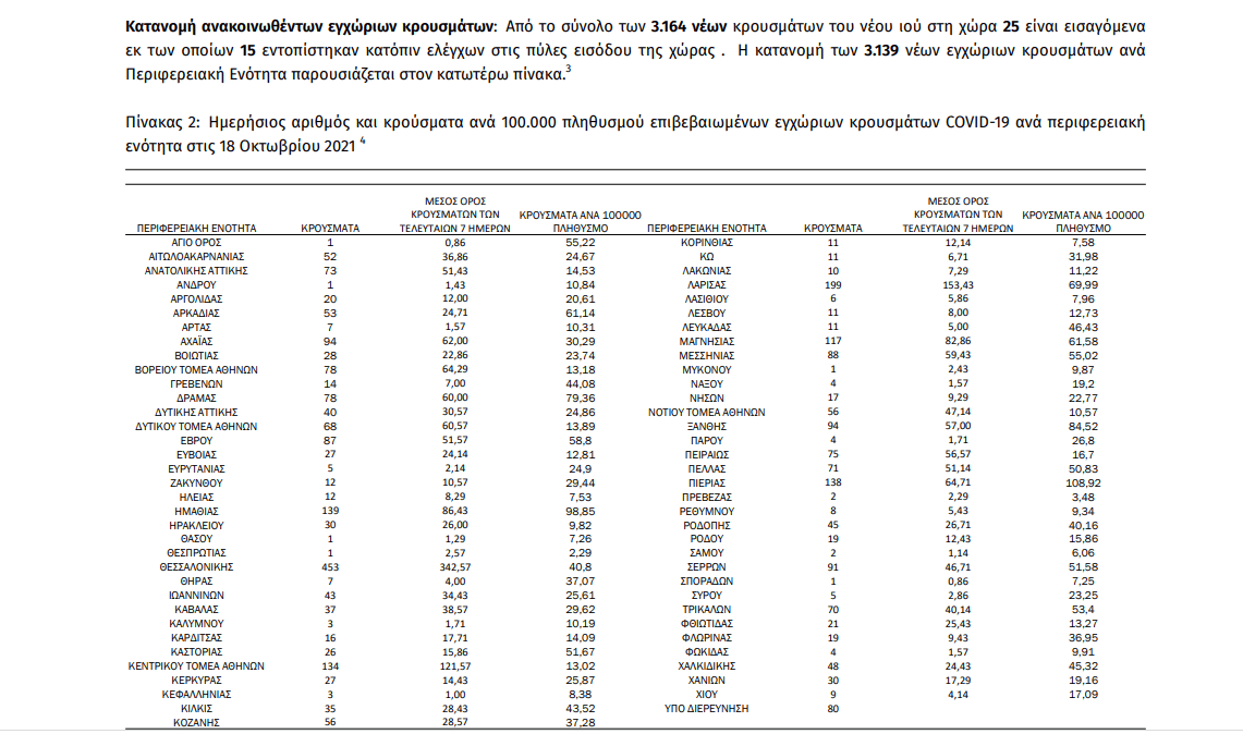 Με βάση τα επιβεβαιωμένα κρούσματα των τελευταίων 7 ημερών, 117 θεωρούνται σχετιζόμενα με ταξίδι από το εξωτερικό και 2.102 είναι σχετιζόμενα με ήδη γνωστό κρούσμα.