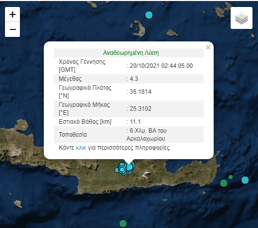 Νέος σεισμός σημειώθηκε στο Αρκαλοχώρι στις 05:44 τα ξημερώματα Τετάρτης, μεγέθους 4,3 Ρίχτερ με επίκεντρο τα 6 χλμ ΒΑ του Αρκαλοχωρίου. Το εστιακό βάθος ήταν στα 11,1 χιλιόμετρα.