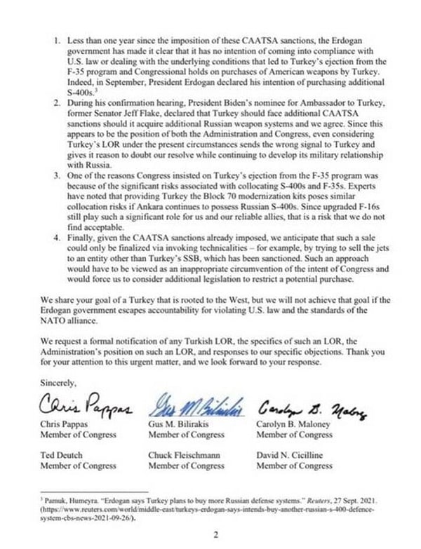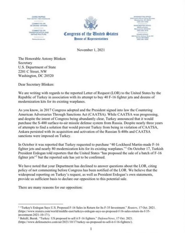 Η νέα επιστολή που εστάλει από 41 μέλη του αμερικανικού Κογκρέσου, με αποδέκτη τον Υπουργό Εξωτερικών των ΗΠΑ, Άντονι Μπλίνκεν, είναι σαφές δείγμα πως υπάρχουν έντονες αντιδράσεις για την πώληση των 40 F-16 και το πρόγραμμα αναβάθμισης 80 μαχητικών που διαθέτει η Τουρκία.