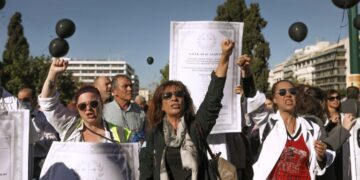 Νέα συγκέντρωση διαμαρτυρίας πραγματοποιούν οι υγειονομικοί κατά της υποχρεωτικότητας του εμβολιασμού αλλά και κατά των νέων μέτρων για την αντιμετώπιση της πανδημίας του κορονοϊού.